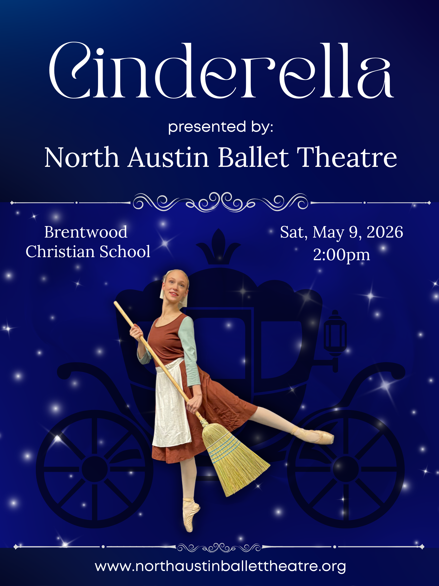 Step into a world of magic, elegance, and timeless storytelling as North Austin Ballet Theatre proudly presents Cinderella. As a pre-professional ballet company dedicated to nurturing the next generation of artists, North Austin Ballet Theatre showcases the talent, discipline, and artistry of young dancers committed to excellence. This enchanting spring production brings the beloved fairy tale to life with graceful choreography, vibrant characters, and all the wonder of the classic story. Join us for an unforgettable evening as dreams take flight, kindness triumphs, and the stage sparkles with the joy of dance.
